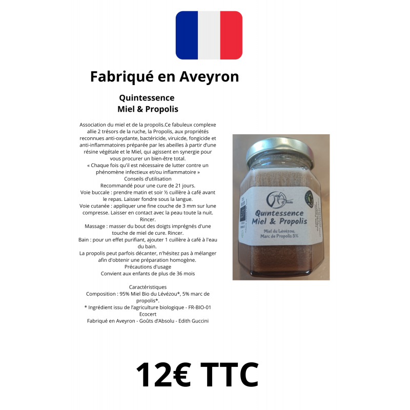 Composition : 95% Miel Bio du Lévézou*, 5% marc de propolis*.