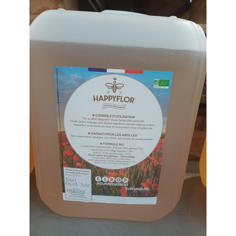 Recette Bio Depuis 2018, Général Ingrédients est engagé dans la création du nourrissement Happyflor®BIO Happyflor®bio SANS SUCRE DE CANNE Aux apiculteurs exigeants qui cherchent une relation durable avec un fournisseur et un producteur français, nous apportons la sérénité par nos conseils et notre fiabilité afin que chacun puisse se concentrer sur son cœur de métier. Véritable défi à relever, la question du sourcing est stratégique pour l’ensemble du processus de fabrication d’Happyflor®Bio, produit à partir de végétaux ou de fruits (suivant les campagnes) issus d’une agriculture biologique de première qualité 100 % originaire d’Europe. Les agriculteurs biologiques qui travaillent nos matières premières respectent les cycles du vivant et ne peuvent utiliser ni pesticide, ni engrais de synthèse. Happyflor®Bio, l’un des meilleurs succédané de miel pour le nourrissement des abeilles en 2018 avec une très forte appétence est ainsi fabriqué avec des sucres simples 100 % assimilables (sans sucre de canne). Les matières premières de qualité étant limitées et la demande très forte, il est impératif d’effectuer vos commandes au minimum 3 semaines à l’avance afin de vous garantir un nourrissement sur-mesure avec une date de durabilité minimale de 12 mois. Happyflor®BIO, le meilleur succédané de miel pour le nourrissement de vos abeilles ¬ Très forte appétence ¬ Effet de dynamisme visible sur les colonies ¬ Texture fluide, grande facilité de distribution ¬ Sucres simples 100 % assimilables (Fructose, Glucose Saccharose) ¬ Très riche en Fructose* (+ 45%) ¬ Garantie sans OGM ¬ Absence de sucres complexes ¬ Absence de pesticides et de conservateurs. *Valeurs indicatives Nourrissez peu, nourrissez mieux