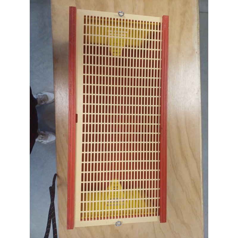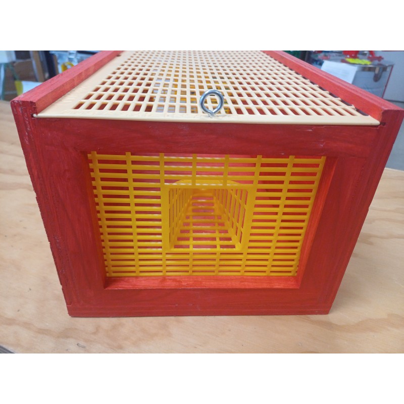 Le piège à frelon asiatique rouge construit dans une boîte en bois fait dans nos ateliers en Aveyron, équipée d'une grille à reine et de deux